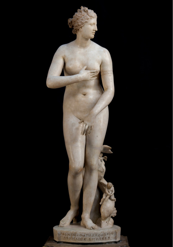The Venus de’ Medici depicts the goddess according to the iconographic type known as the Venus Pudica, in which the figure instinctively covers her breasts and pubis, as if she had become aware of an indiscreet gaze. This model derives from the Aphrodite of Knidos by Praxiteles (4th century BC) and enjoyed wide diffusion during the Hellenistic and Roman periods. An inscription on the base attributes the statue to Cleomenes, son of Apollodorus, an Athenian sculptor.