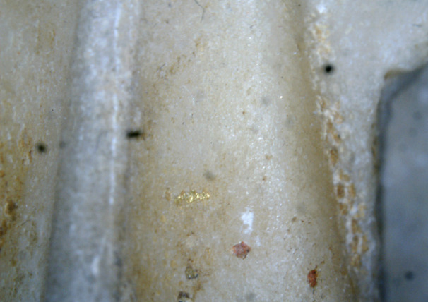 The bust, cut below the pectorals and including part of the arms, depicts the emperor in military attire. He wears a cuirass over a tunic, adorned at the center with a relief gorgoneion, featuring wings and serpents coiling beneath the chin. Over the left shoulder falls a paludamentum, fastened with a fibula; the shoulder strap is decorated with a wolf’s head gripping a knotted ribbon, beneath which appears a six-petaled rosette. Traces of gilding detected on the cuirass attest to the statue’s original polychromy.