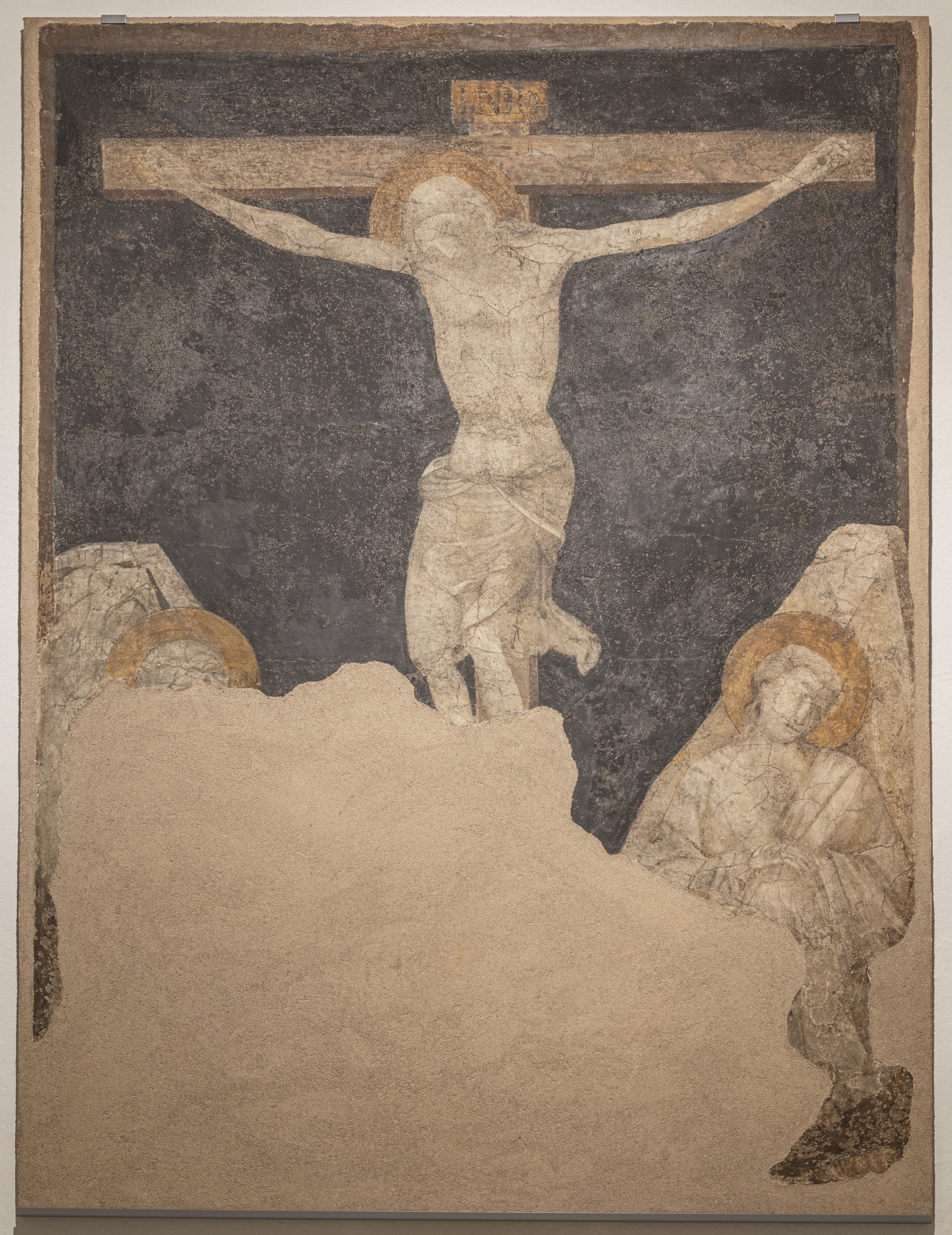 La Crocifissione con i dolenti in umiltà è la rappresentazione del Cristo crocifisso con la Vergine e san Giovanni seduti ai piedi della croce, in un atteggiamento di contrizione che catalizza sul loro dolore l’attenzione dello spettatore. La letteratura che indica nell’umiltà un exemplum vivendi si fonda sulla frase di Cristo “Qui se humiliat exaltabitur” (Lc 14, 11; trad.: colui che si umilia sarà esaltato). Un collegamento tra questa virtù e il suolo si riscontra già in Isidoro da Siviglia (560-636), il quale affermava che, etimologicamente, humilitas proverrebbe dal termine latino humus, cioè terra. Nella Legenda Aurea di Jacopo da Varagine si individua poi un collegamento più puntuale con la Croce: «I quattro capi della croce si ornano con le gemme di queste quattro virtù: in alto, sopra tutte, la carità; a destra l’obbedienza; a sinistra la pazienza; in fondo, confitta nel terreno, la radice di tutte le virtù, l’umiltà» (I. DA VARAGINE, Legenda Aurea (1260-1298 ca), ed. a cura di A. Vitale Brovarone e L. Vitale Brovarone, Torino 1995, p. 284). - current technical condition