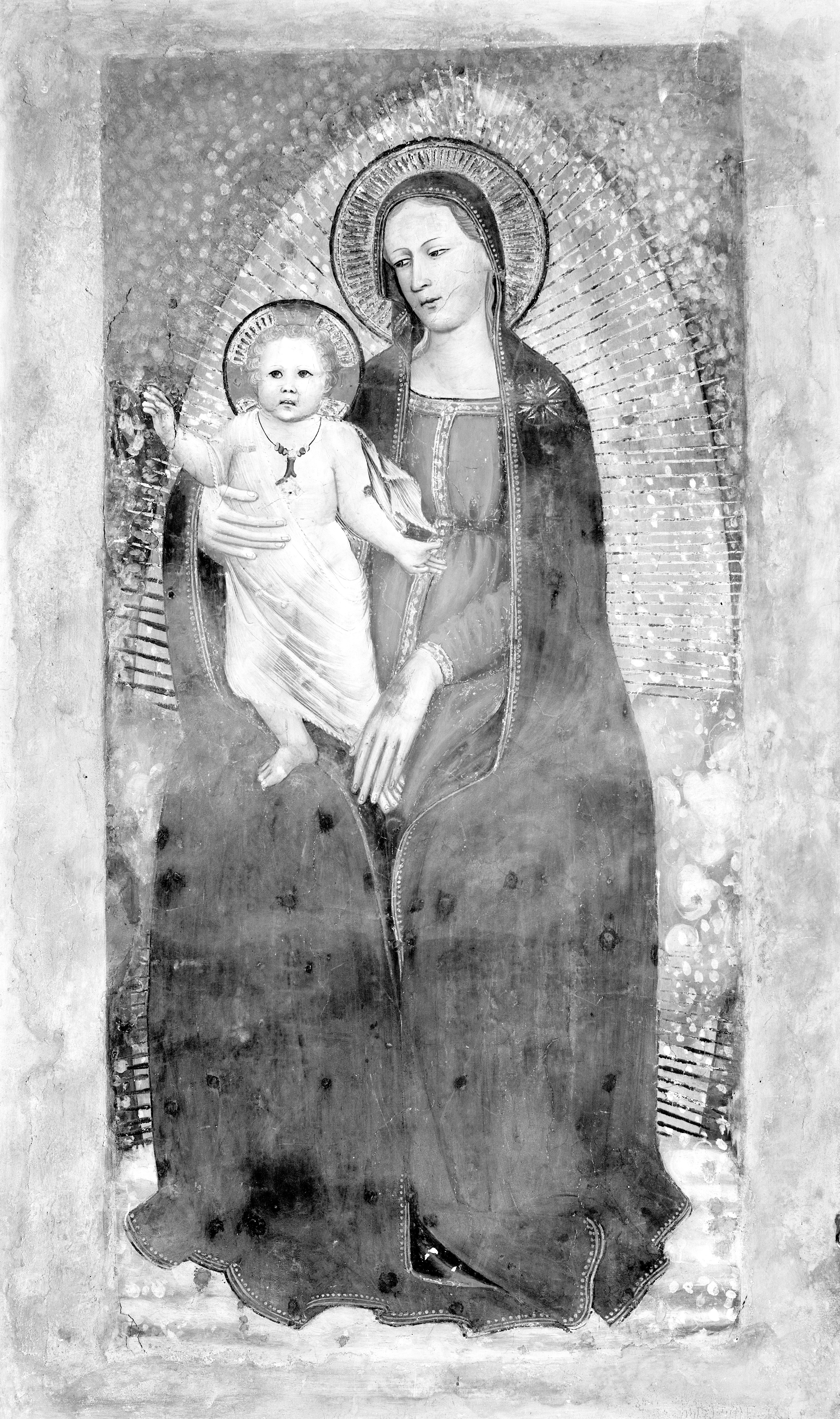 Pur non essendo datata, la fotografia è stata probabilmente scattata prima dell'intervento di restauro condotto dopo l'alluvione del 1966 da Tintori-Rosi-Del Serra. Lo stato conservativo, infatti, risulta più o meno come quello documentato dalla foto n. 129737, datata al 1965. Inoltre, il confronto con lo stato attuale dell'opera rivela l'assenza, nella foto storica, della grande lacuna presente nell'angolo in alto a sinistra dell'affresco: questa perdita di colore potrebbe spiegarsi con un danno causato dall'alluvione. Più probabilmente, si trattava di una ridipintura condotta durante un intervento conservativo più antico, volto a conferire maggior regolarità all'affresco: nella fotografia, infatti, il formato dell'opera è perfettamente rettangolare, a differenza di quello attuale. Simili ridipinture antiche potrebbero essere poi state rimosse dall'intervento successivo all'alluvione. Alle acque dell'Arno, invece, si può forse imputare la caduta totale della decorazione dell'orlo della veste della Madonna, che nella fotografia risulta interamente punteggiato di bianco.