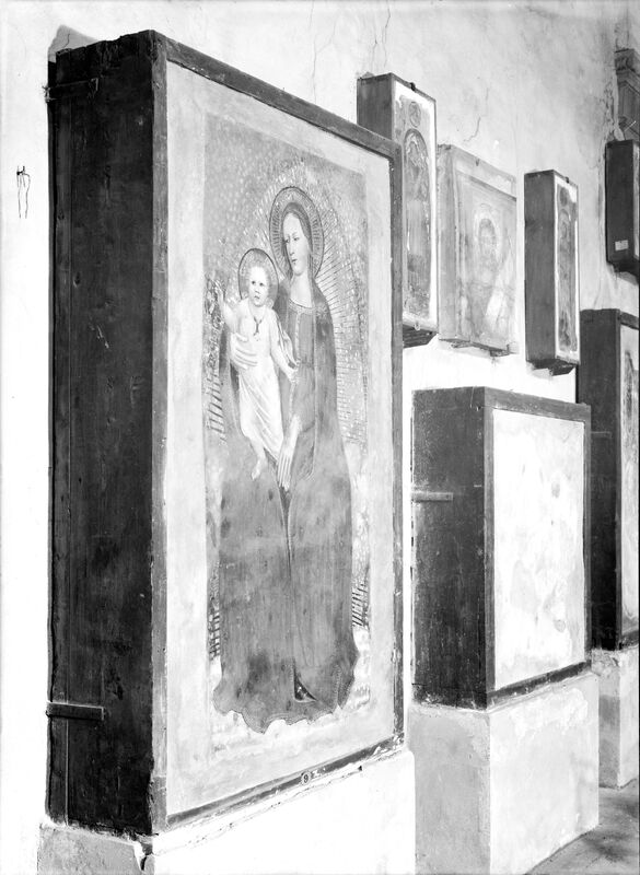 Questa fotografia storica mostra lo stato degli affreschi prima dell'alluvione del 1966 e il loro allestimento all'interno del museo del Cenacolo di Ognissanti. Lo scatto documeta inoltre il notevole spessore degli affreschi staccati a massello, poi "assottigliati" dall'intervento di restauro successivo all'alluvione e condotto da Tintori-Rosi-Del Serra.