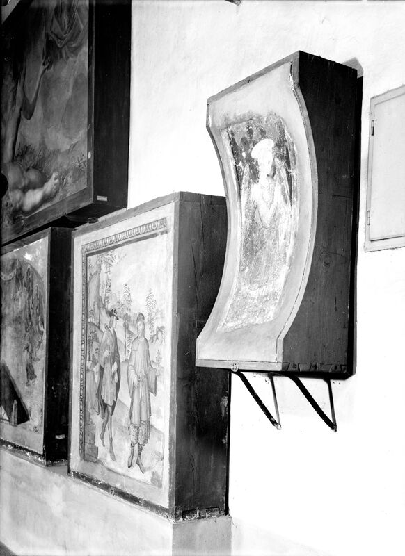 Questa fotografia storica mostra lo stato degli affreschi prima dell'alluvione del 1966 e il loro allestimento all'interno del museo del Cenacolo di Ognissanti. Lo scatto documeta inoltre il notevole spessore degli affreschi staccati a massello, poi "assottigliati" dall'intervento di restauro successivo all'alluvione e condotto da Tintori-Rosi-Del Serra.