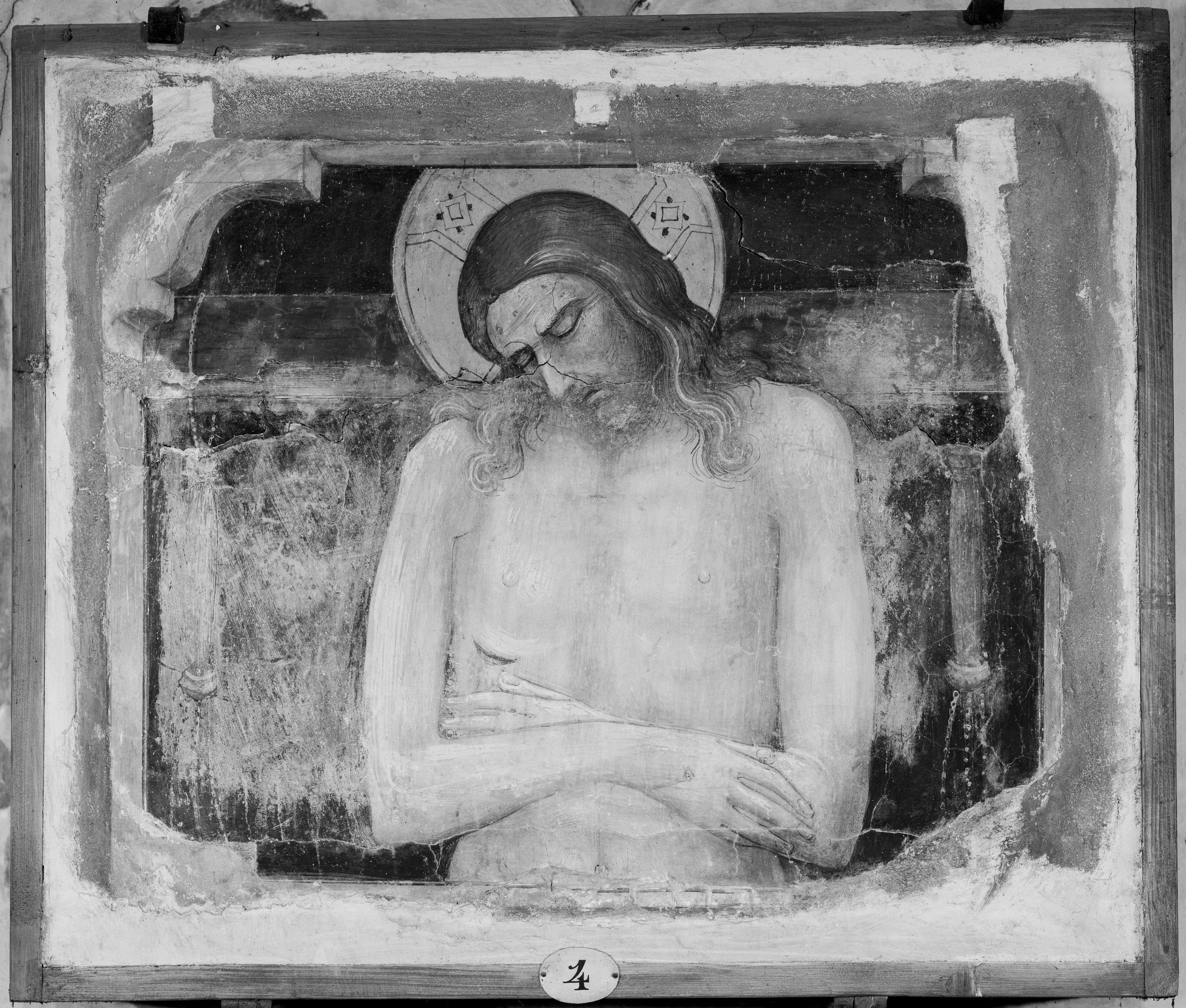 Questa fotografia storica, che documenta lo stato dell'affresco prima dell'alluvione del 1966, mostra l'opera entro un telaio di legno su cui si legge il numero 4, che faceva probabilmente riferimento al numero di inventario assegnato all'affresco nel museo del Cenacolo di Ognissanti. - has current owner
