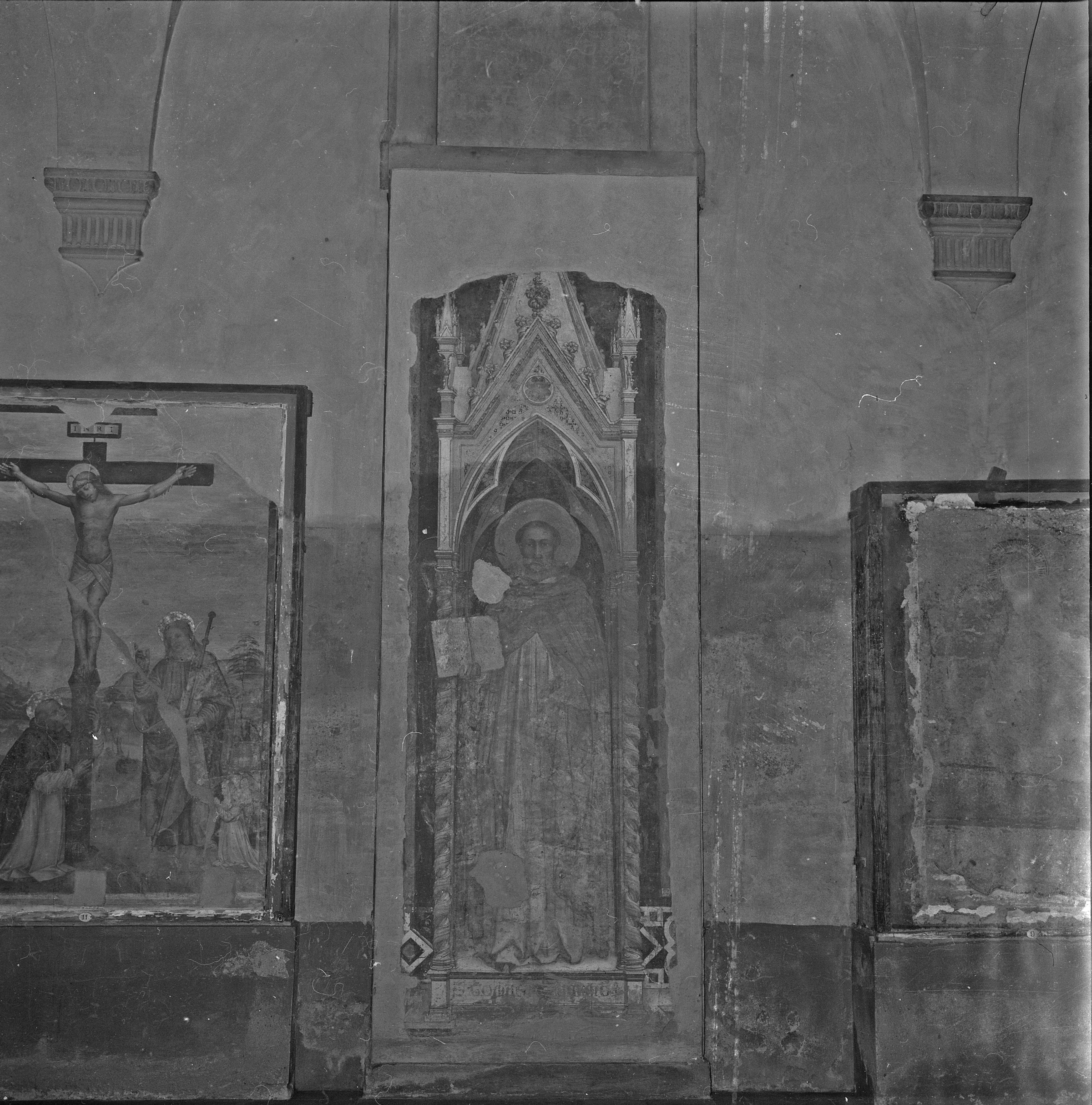Questa fotografia mostra il punto in cui arrivarono le acque dell'Arno durante l'alluvione del 1966 e documenta come molti degli affreschi esposti nel Cenacolo di Ognissanti finirono quasi completamente sommersi. In particolare, lo scatto mostra la Crocifissione di Bartolomeo di Giovanni, oltre al San Tommaso di Aquino, attribuito a Stefano fiorentino, che non fa parte della collezione giunta al Museo degli Innocenti (per l'opera si veda G. Ravalli, in Ricerche a Santa Maria Novella 2016).