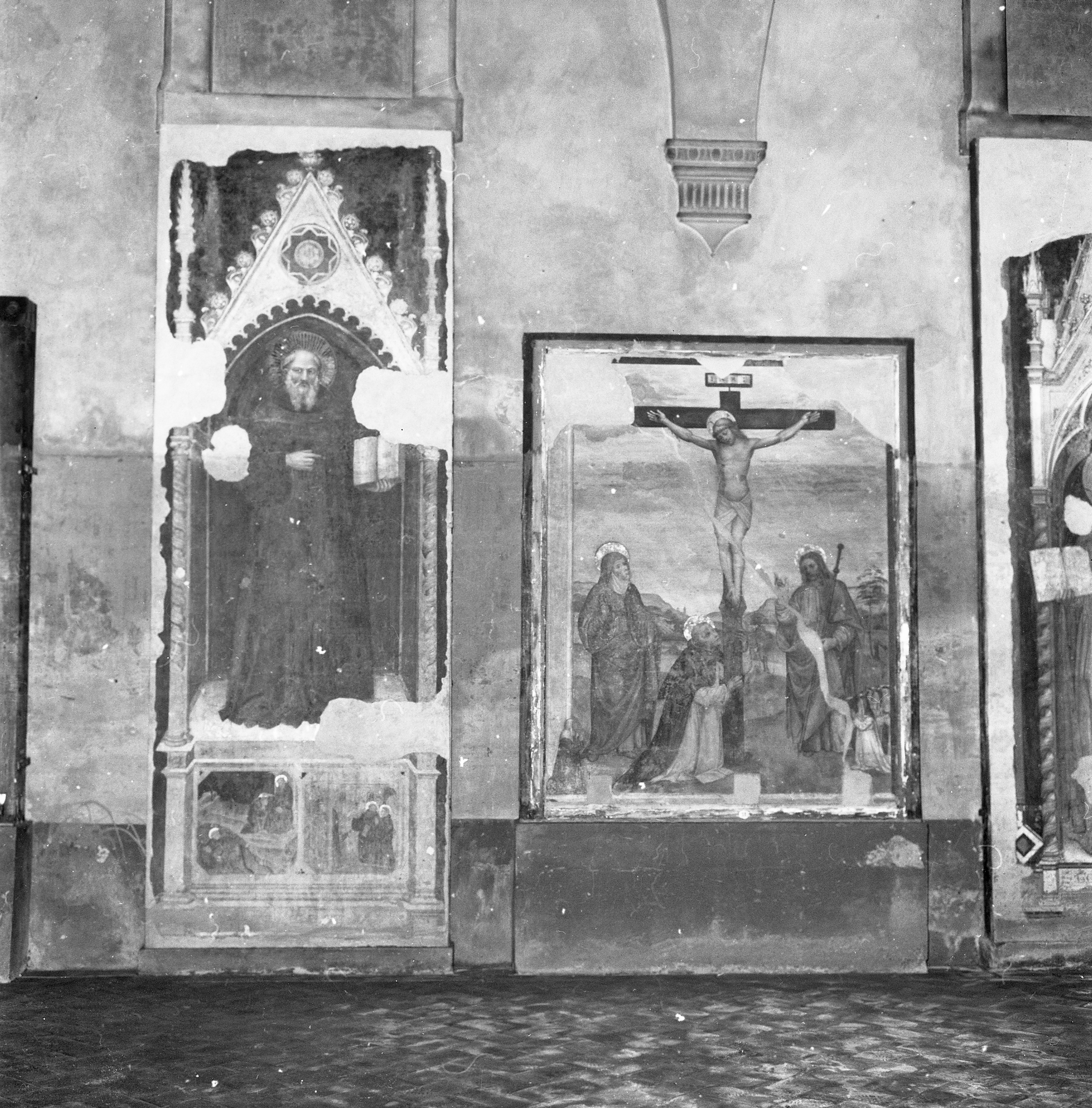 Questa fotografia mostra il punto in cui arrivarono le acque dell'Arno durante l'alluvione del 1966 e documenta come molti degli affreschi esposti nel Cenacolo di Ognissanti finirono quasi completamente sommersi. In particolare, lo scatto mostra la Crocifissione di Bartolomeo di Giovanni, oltre al Beato Mauro (o San Benedetto), attribuito a Nardo di Cione, che non fa parte della collezione giunta al Museo degli Innocenti (per l'opera si veda G. Ravalli, in Ricerche a Santa Maria Novella 2016).